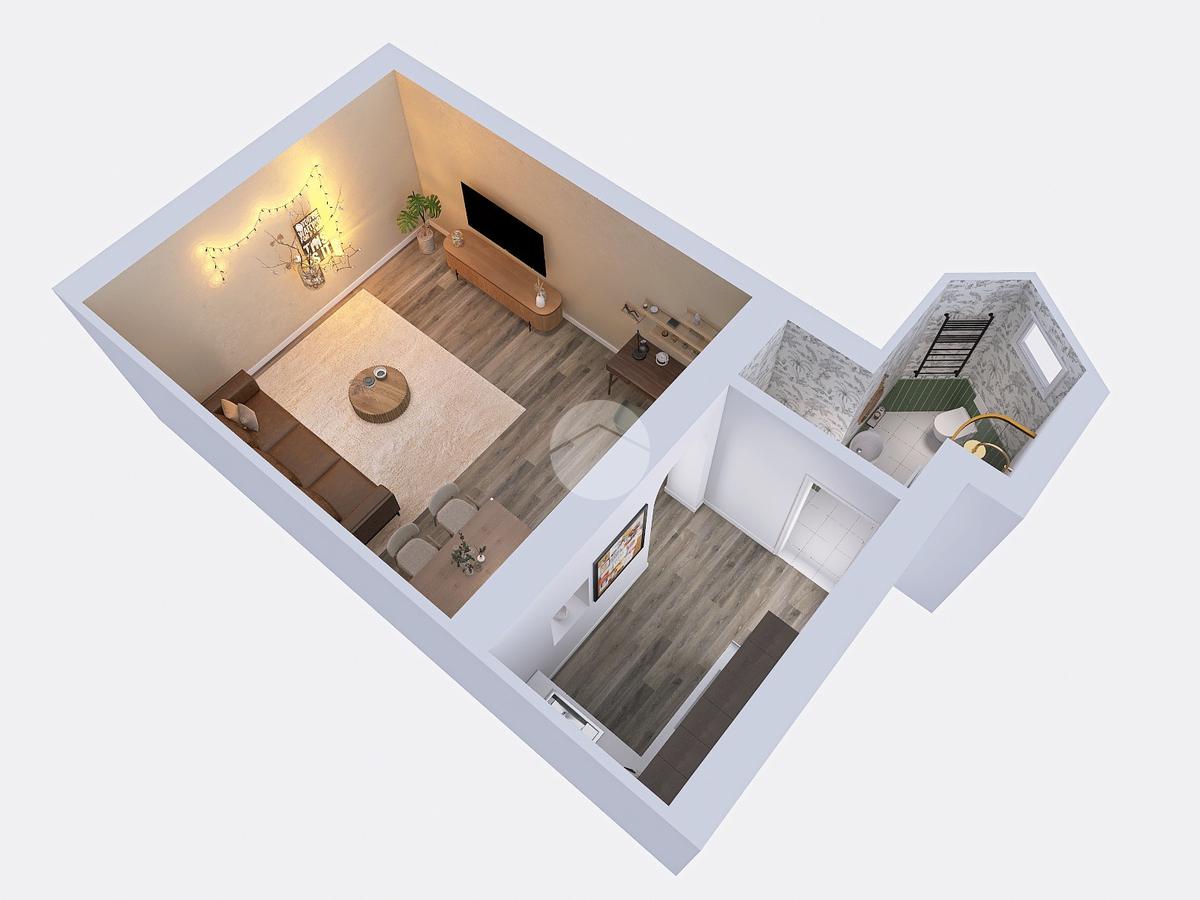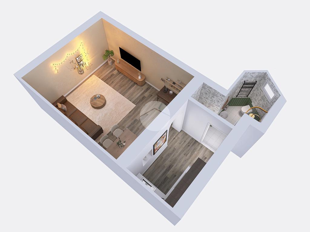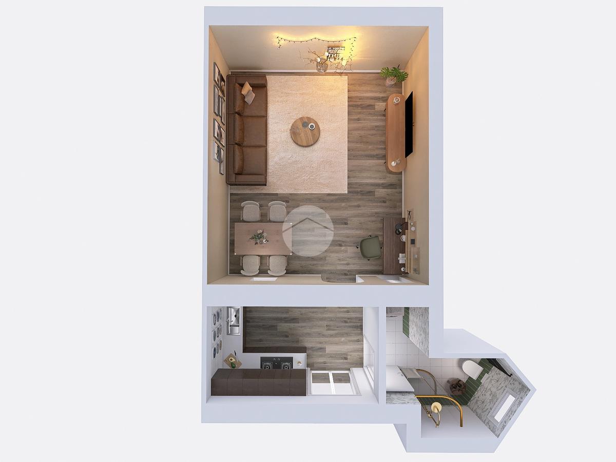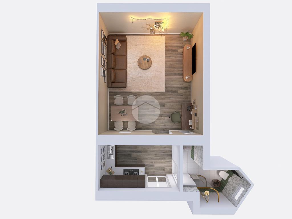 Composto da: ingresso con angolo cottura, ampio ambiente personalizzabile e servizio finestrato.